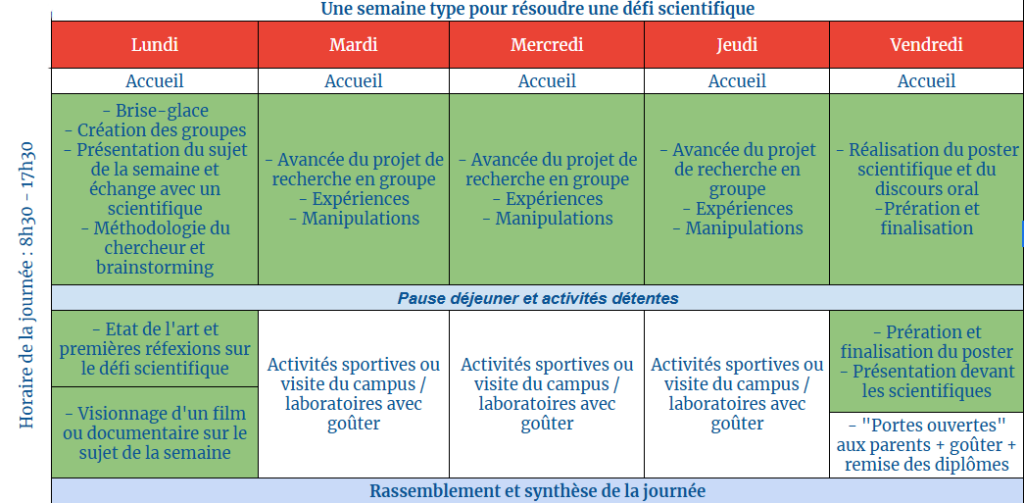 L’emploi du temps est conçu pour faire découvrir un sujet scientifique à résoudre en lien avec l’actualité de la recherche et pour découvrir le campus. Tous les jours, les temps  dédiés au sport, aux jeux et à la discussion renforcent l’expérience de vie collective sont aménagés. Ainsi, les enfants et adolescents vivent une semaine de cheminement intellectuel et personnel qui les fera grandir en sciences.