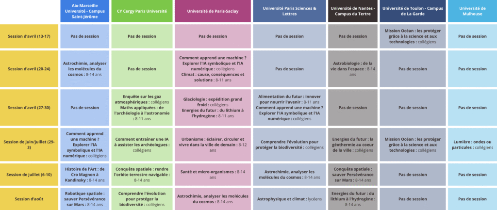 Cette année, nous proposons des science camps dans plusieurs universités à Paris, Marseille, Nantes, Toulon et Mulhouse.