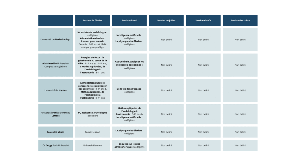 Planning des Science Camp pour l’année 2026